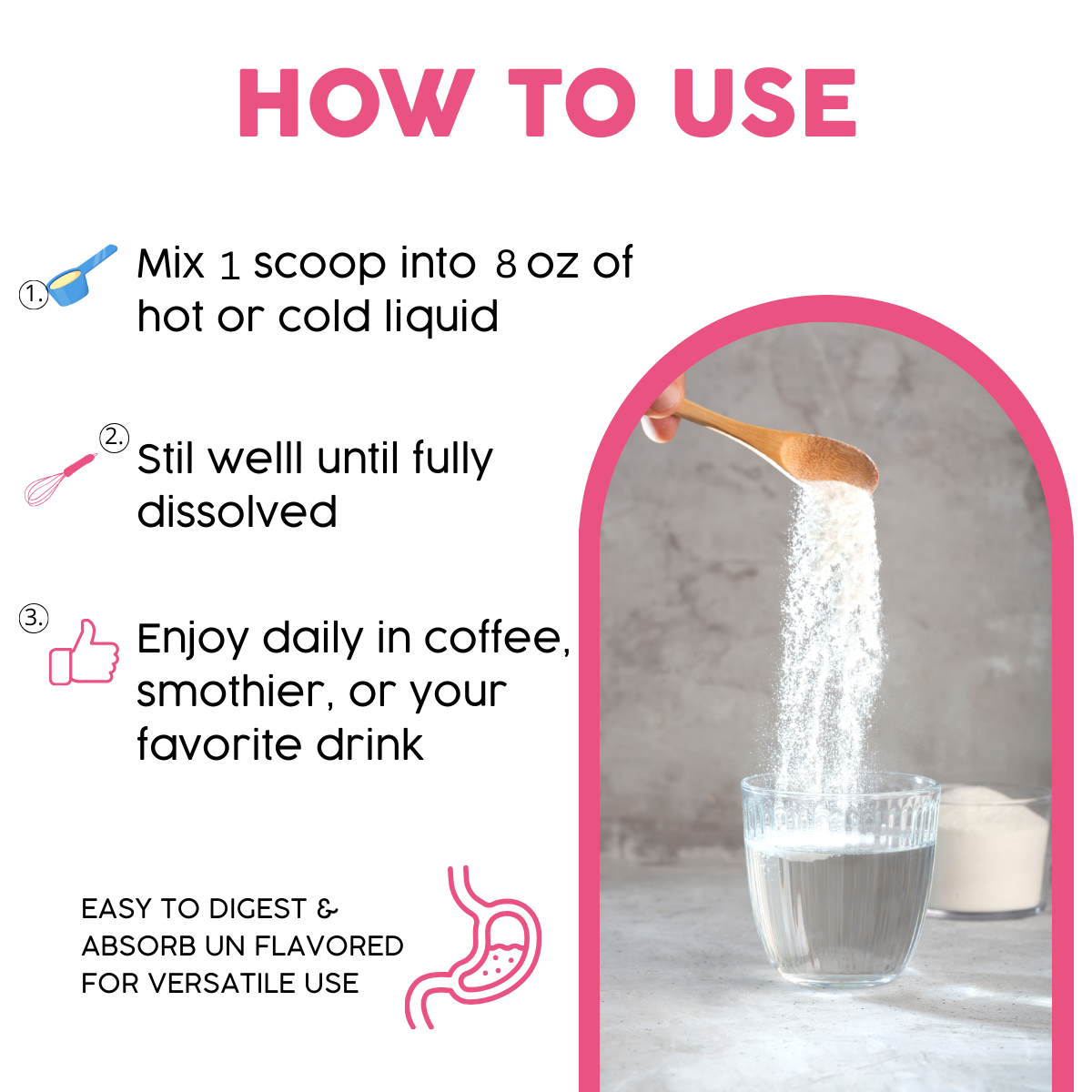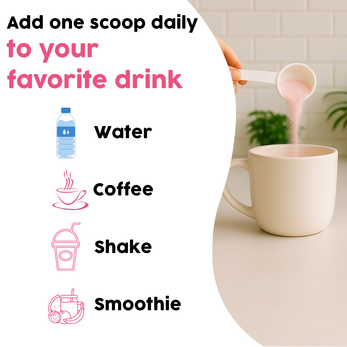 - Mix one scoop into a glass of water, juice, coffee, milk, or your favorite smoothie.