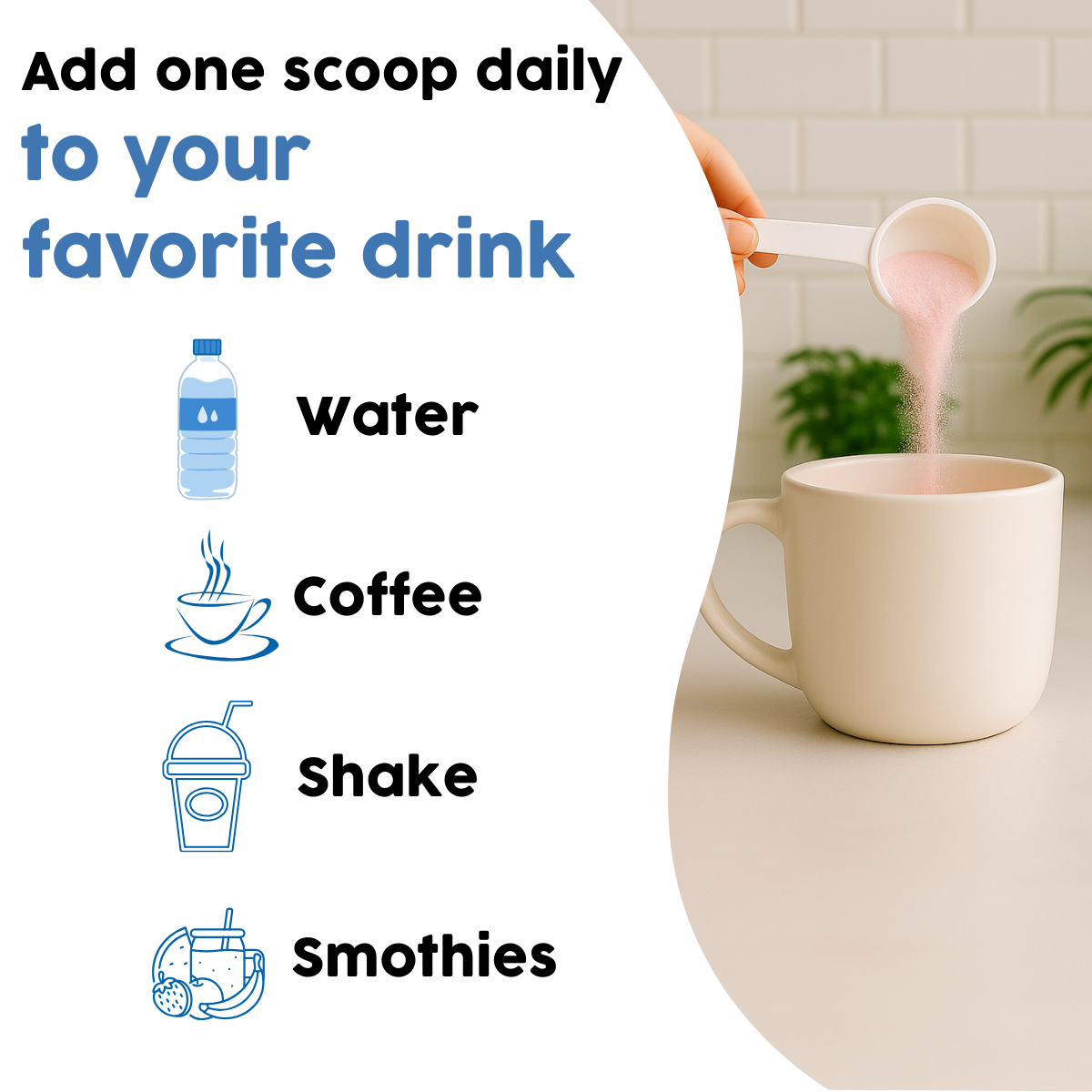 - Mix one scoop into a glass of water, juice, coffee, milk, or your favorite smoothie.